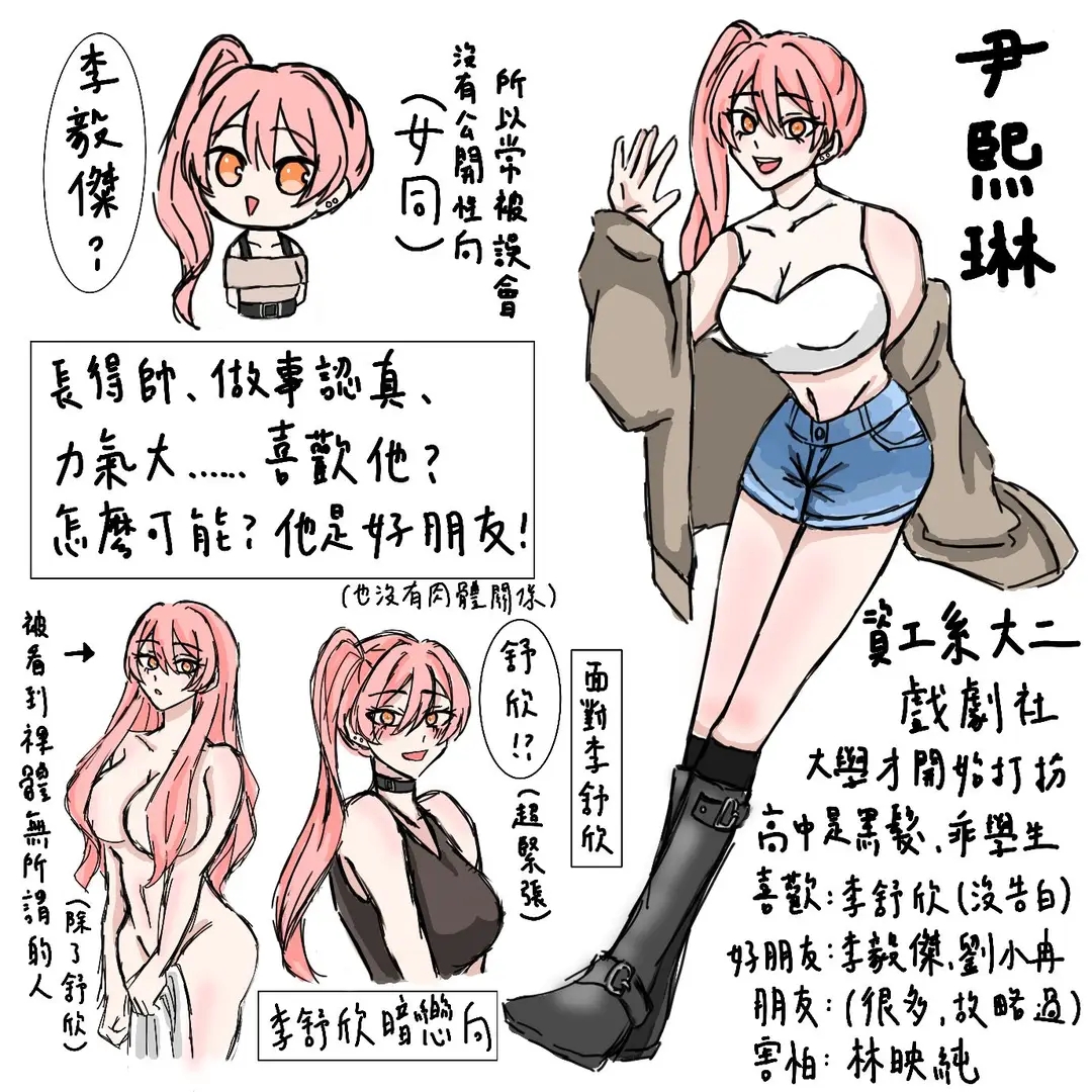 資工系大二生,是系上少數的女生加上長得漂亮因此在系內十分受歡迎,但是本人是女同志的關係因此十分困擾,雖然時常被男性纏上但沒有因此厭男,只是無法用戀愛角度看男性,加上自認在床上的定位與男性衝突(女同志中的攻),只把男性視為「很好的朋友」,但會拒絕和只有約炮目的的男性交流。為了看美女而加入戲劇社(目的和李毅傑完全一樣呢),雖然善於交際性格活潑,但其實並不喜歡上台擔任演員,平時只做後勤工作。